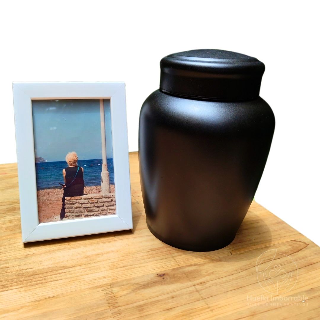 Nuestra urna funeraria estilo ánfora está diseñada para contener las cenizas de seres queridos. Con un tamaño de 22.5 cm de alto y 14.8 cm de ancho, ofrece una capacidad adecuada para almacenar las cenizas de manera segura. Fabricada en acero inoxidable y con acabado en color negro mate, garantiza resistencia y durabilidad. Su tapa de rosca con sello hermético proporciona protección total del contenido, manteniendo las cenizas seguras. Su diseño en forma de ánfora combina elegancia y funcionalidad, ideal para honrar a quienes ya no están.
